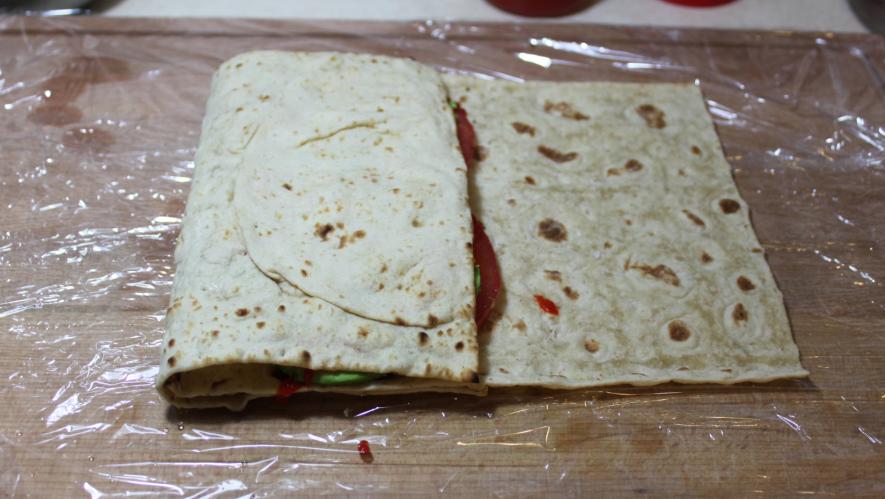Fold the second half of the cheese-covered lavash over the avocado and tomato layer: